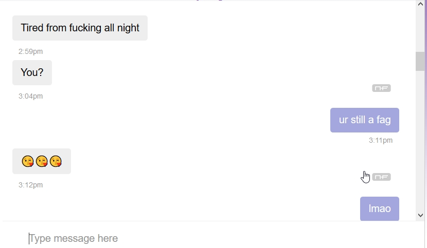 So, of course, I responded to his pathetic attempt at challenging Me by telling him “ur still a fag”.  And since I was right, and he is still a fag, he sent back kisses for Me.  To which I could only LMAO.  Every time I look at this brief exchange, I LOL!  Fucking all night?  Maybe, but you’re still My fucking pansy.